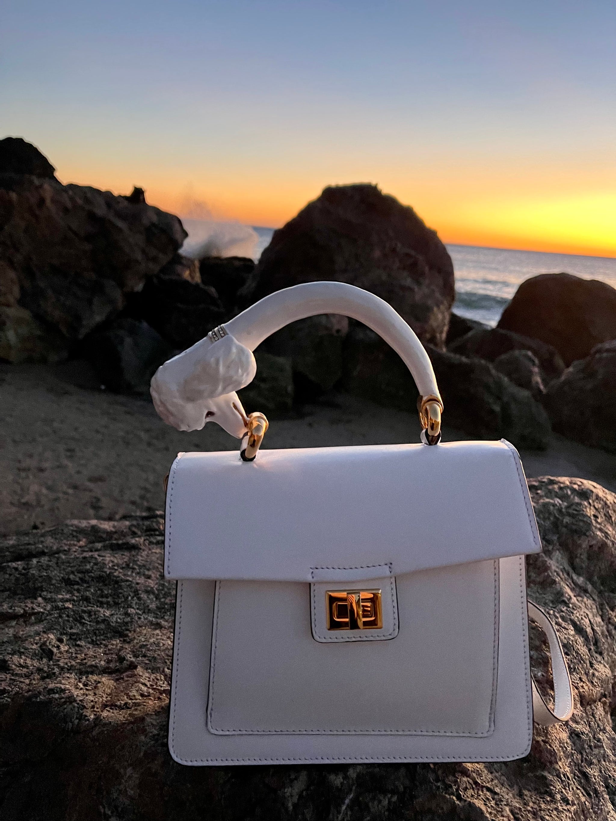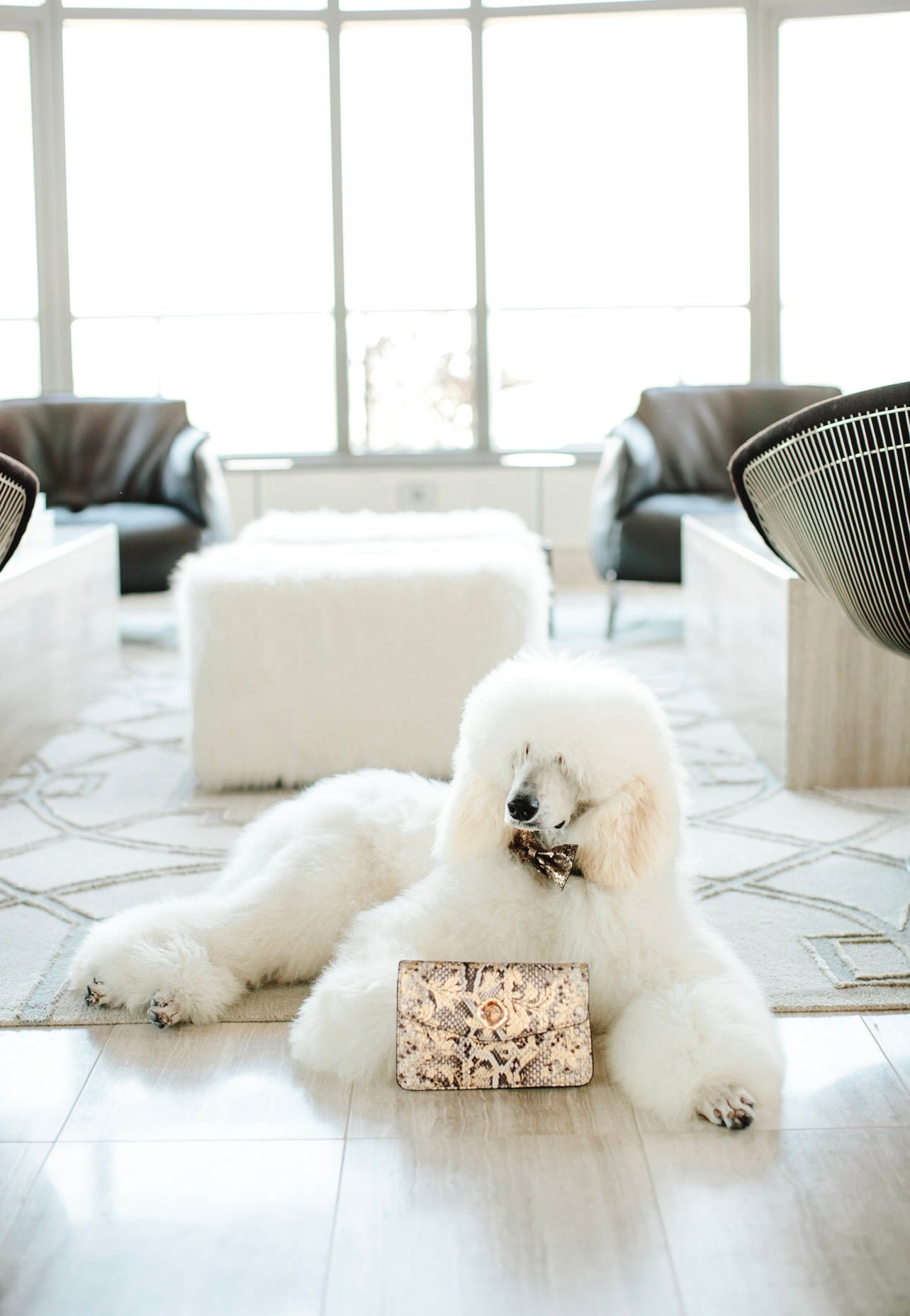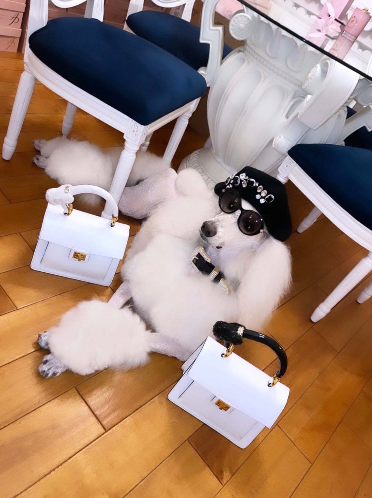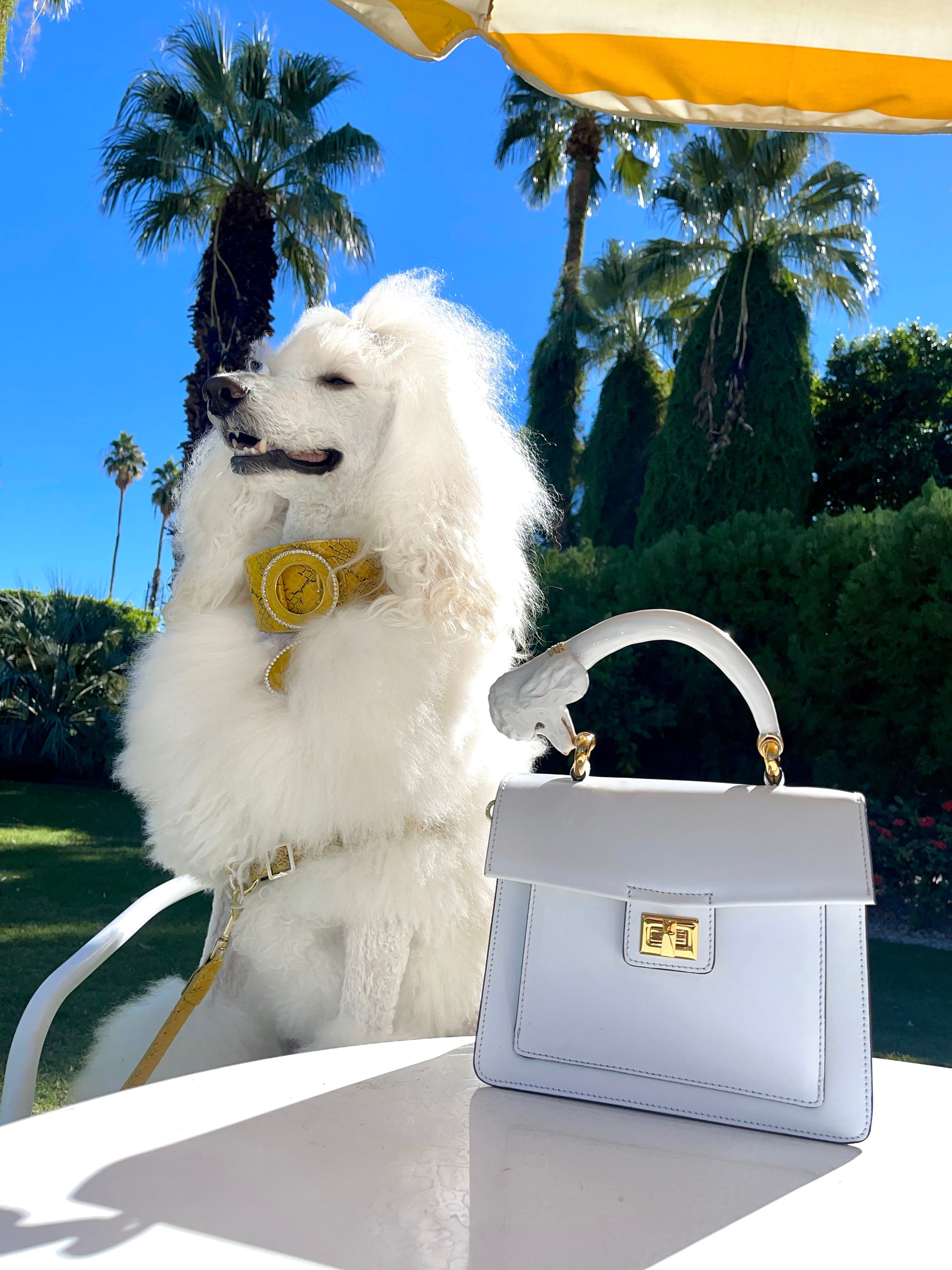 This Pearl White Italian Leather Handbag with a Pearl White Handcrafted Pearl White/Swarovski Crystal Handle is named The Sebastian Bag. After the Designer’s love of her Standard Poodle, Sebastian and the inspiration behind the entire exclusive Poodle Handle Collection! Elegant, unique, conversation piece.