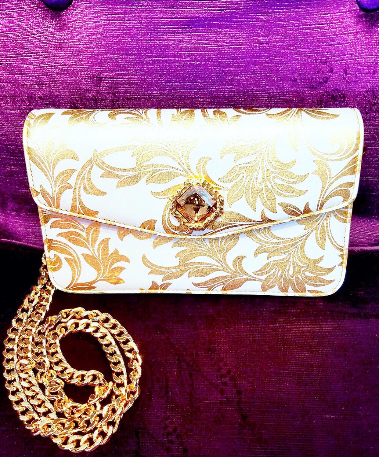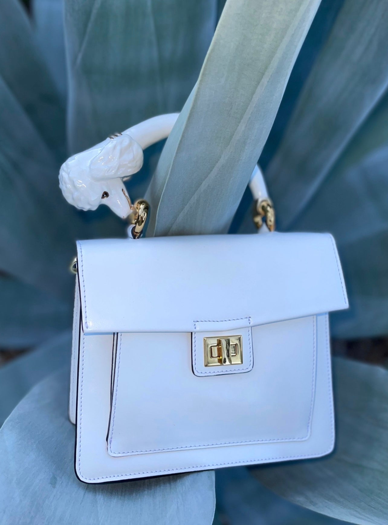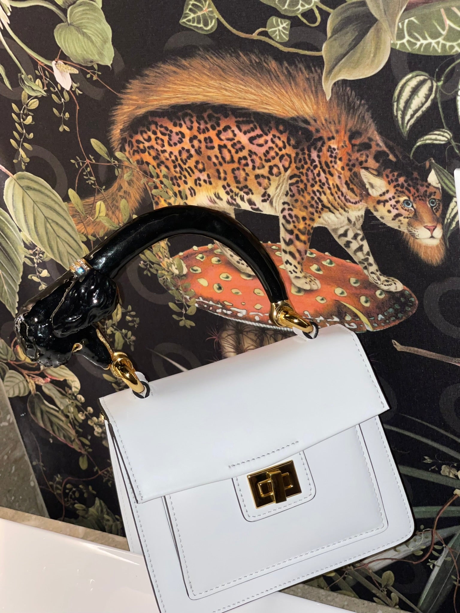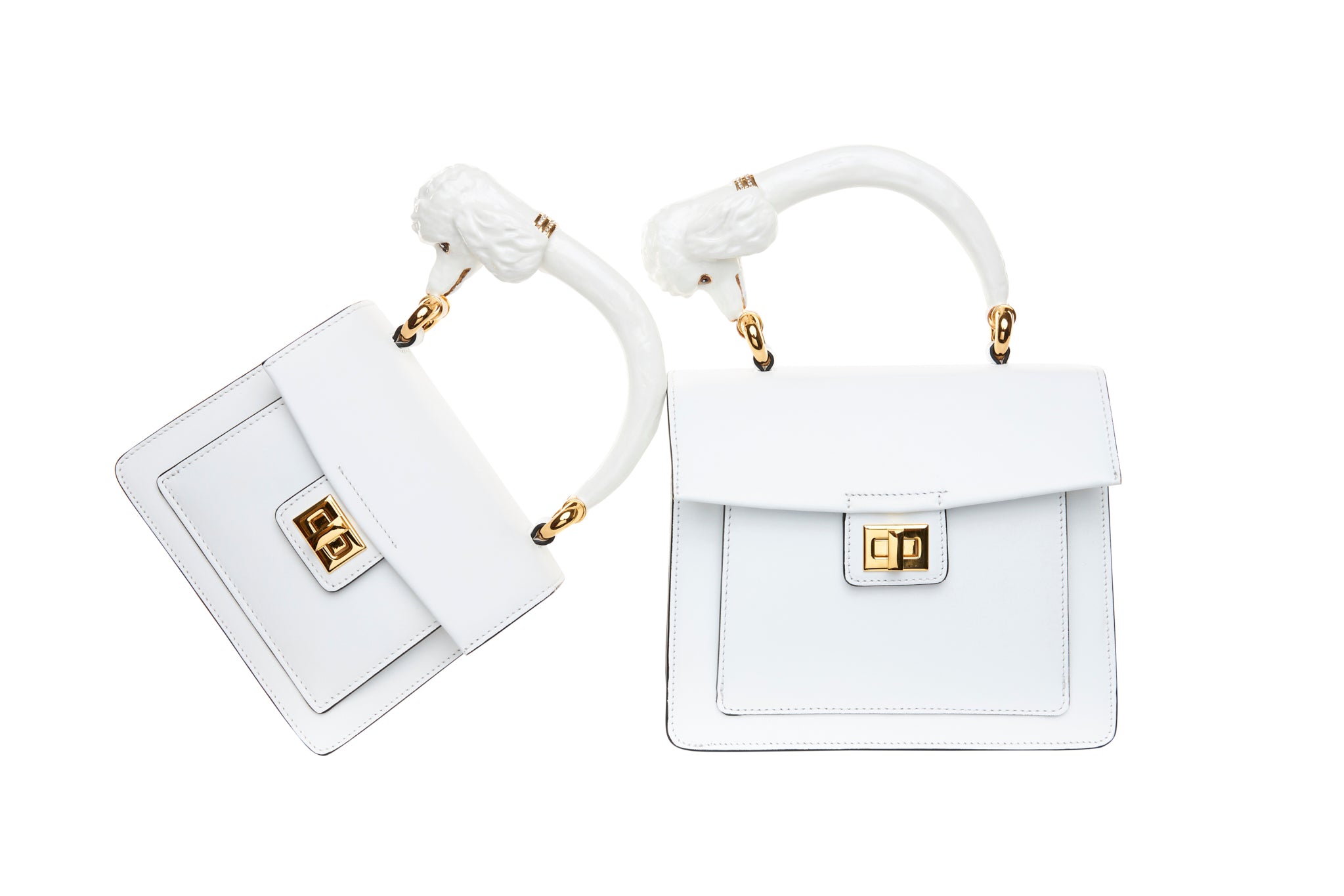 White Italian Leather with our Pearl Black/Swarovski Crystal Poodle Handle.