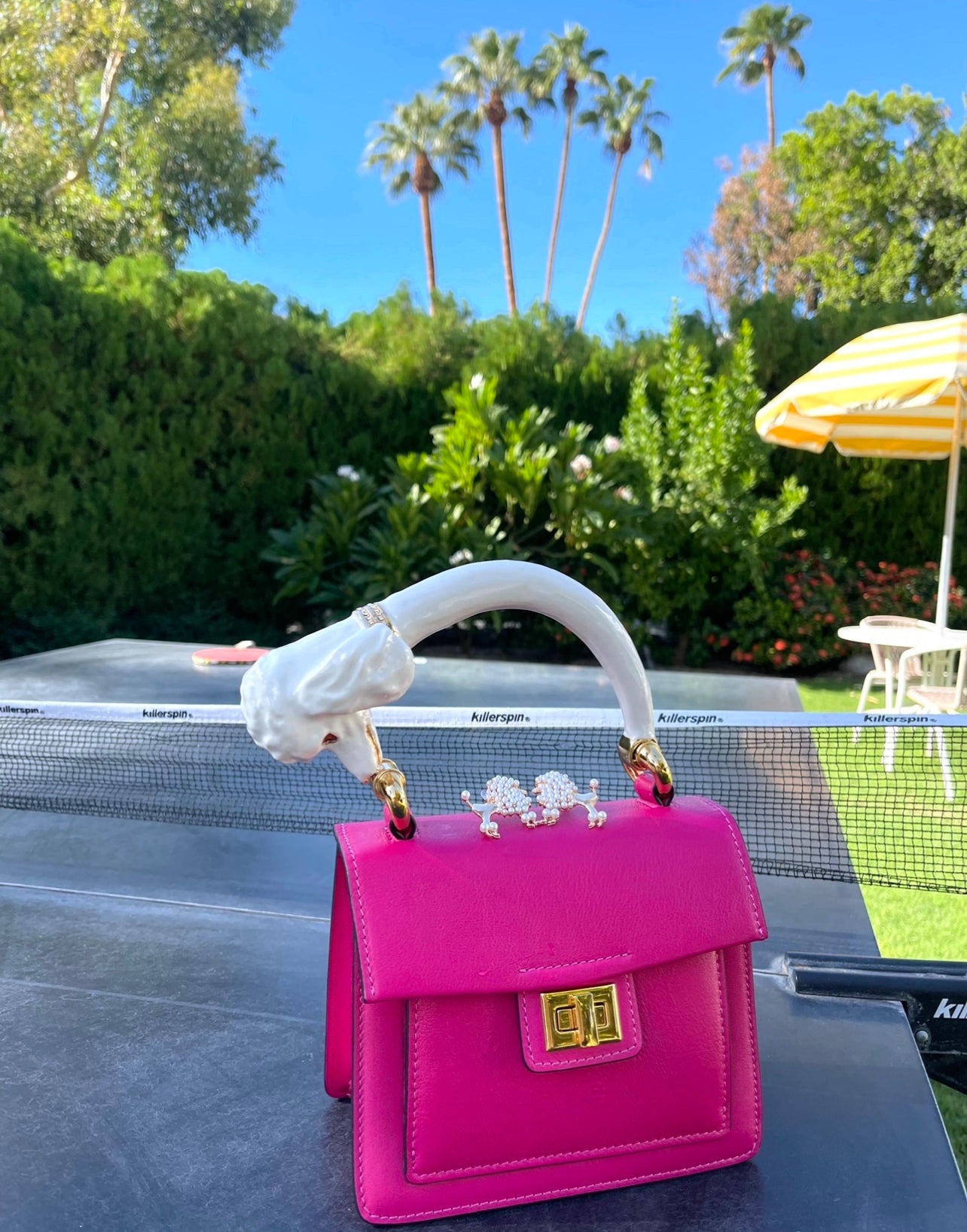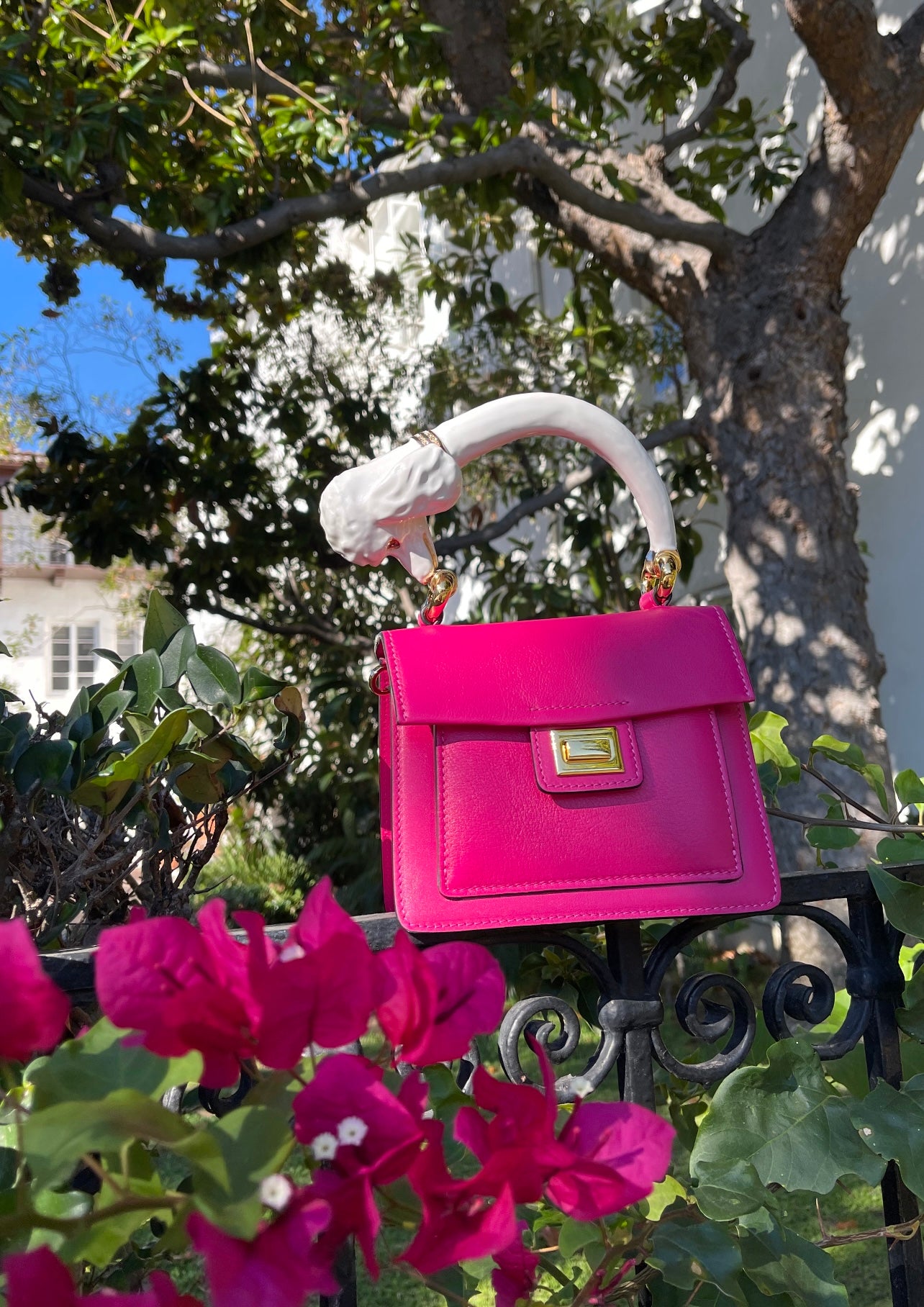 Fuchsia Pink Italian Leather with our Pearl Black/Swarovski Crystal Poodle Handle.