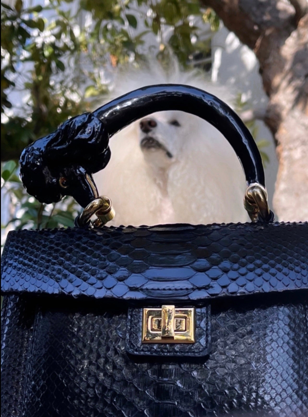Elegant, unique, conversation piece. This Allysa Payne x Sebastian Poodle Handle Handbag, is hand crafted in Italy, using the highest quality Italian leather & materials.