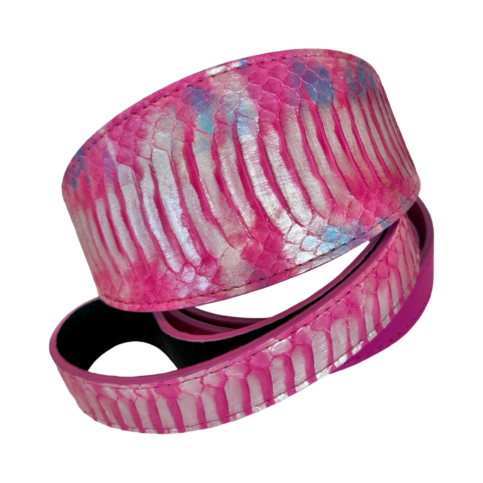 Made from Authentic Iridescent Snake, this exceptional set captures the light with a luminous blend of vibrant pink and soft blue, accented by subtle purple undertones that reveal the natural dimension and beauty of each scale. The finish shifts gracefully in natural light, creating a captivating glow that makes every piece entirely unique.